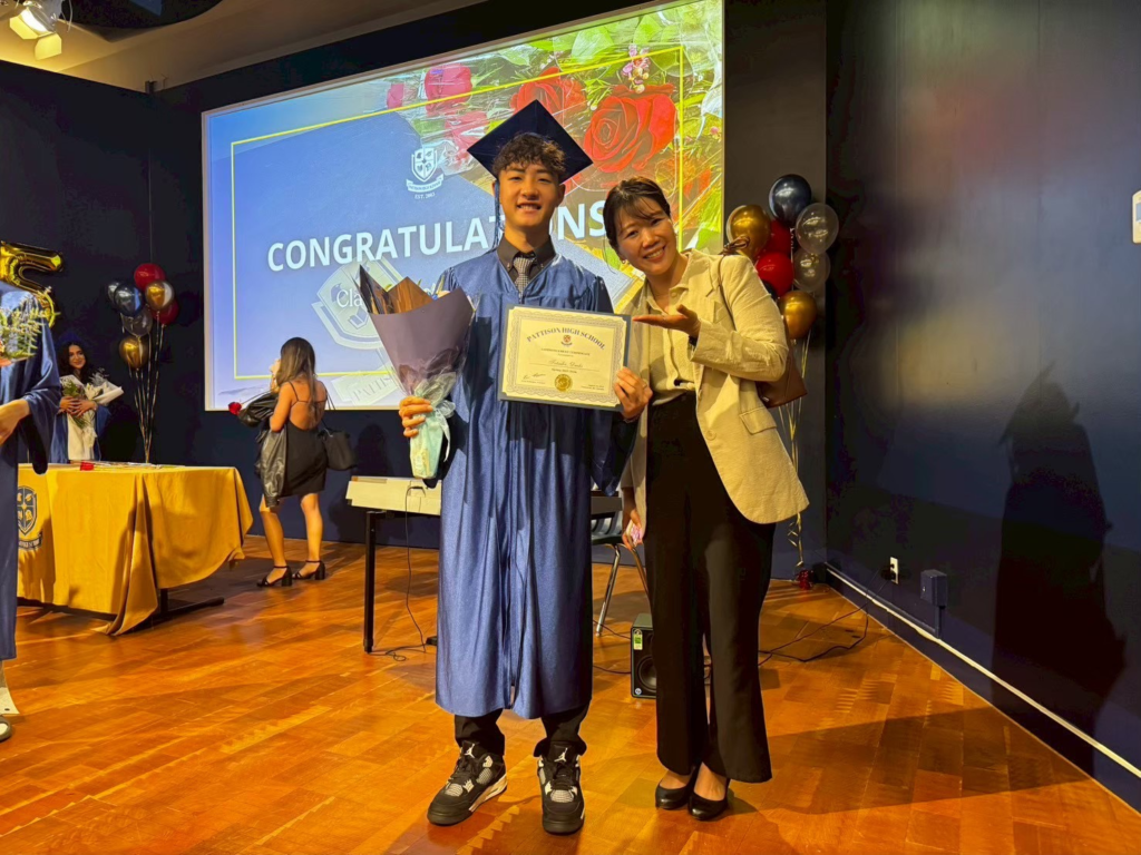 D君の良いところも、時に心配な部分も、すべてを受け止めながら歩んでこられたお母様の深い愛情には、私たちも何度も励まされました。この卒業は、D君自身の努力はもちろんのこと、ご家族の無償の愛と信頼があったからこそ迎えられた大きな節目です。D君はこの留学を通して、学業だけでなく「人との関わり方」「感謝する心」「挑戦する強さ」を身につけたね、心身ともに成長した姿を最後に見ることが出来て嬉しかったよ!