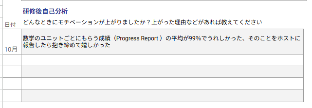 9月から就学が開始となり、10月、11月と面談を行っていますが、全て順調そうでとても嬉しい限りです!ホストとの勘違いによる気まずさを経験したりと苦い思いもしていますが、そこをあまり気にしすぎない様にご自身のメンタル面を調整したり、この失敗から学ぶ姿勢があるので、何が起こっても一つずつ自分のペースで解決していっている姿がいつも印象的です!周りのお友達とも自分から関わっていく姿勢を持つように意識していて素晴らしいですし、そこを頑張りすぎて疲れない様にうまいこと肩の力も抜けてそうだなと話をしていて感じます^^お話をしていても優しさと明瞭さにあふれていることがすぐにわかりますし、何頃もバランスが良いRちゃん、これからもRちゃんのペースを大事に、自分を信じて突き進んでいってくだださいね!