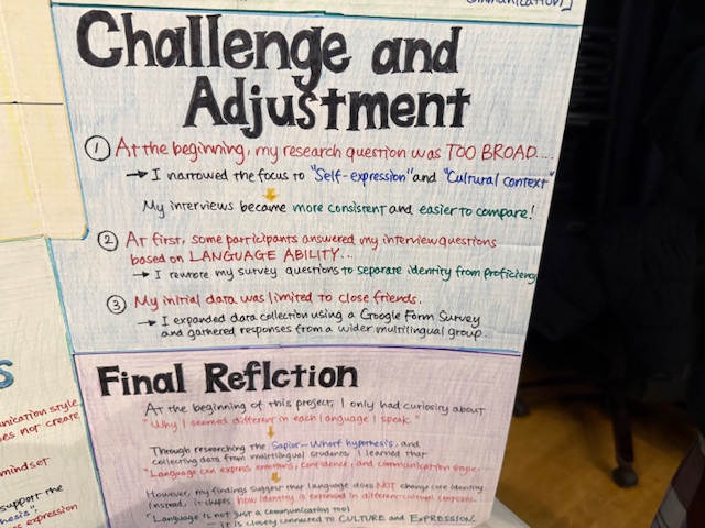 そして迎えたキャップストーン発表当日。多くの学生、先生、家族、在校生が身に来る中で落ち着いた表情で英語のプレゼンテーションをするKちゃん。3年前、初めてカナダに来た頃は緊張しながら一生懸命単語を探して話していた姿を思い出しました。高校留学という3年を経て、今は自分の考えを、自分の言葉で、堂々と英語で伝えている。発音や表現力だけでなく、何よりも「自信」がそこにありました。